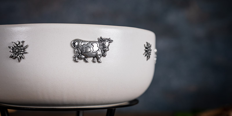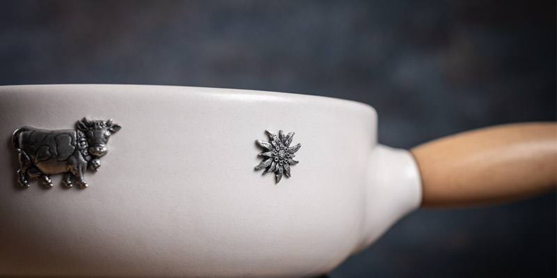 Das Caquelon wird in Rikon mit einem Buchenholzgriff und dekorativem Metalldekor (Edelweiss- und Kuhapplikationen) veredelt.