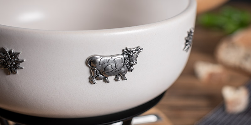 Das Caquelon besteht aus weissem Ton und enthält einen edlen Buchenholzgriff, welcher in der Schweiz hergestellt wird. Die versilberten Edelweiss- und Kuhapplikationen werden ebenfalls in der Schweiz hergestellt und aufgebracht. Das Spezial-Caquelon ist für alle Herdarten geeignet, inklusive Induktion.