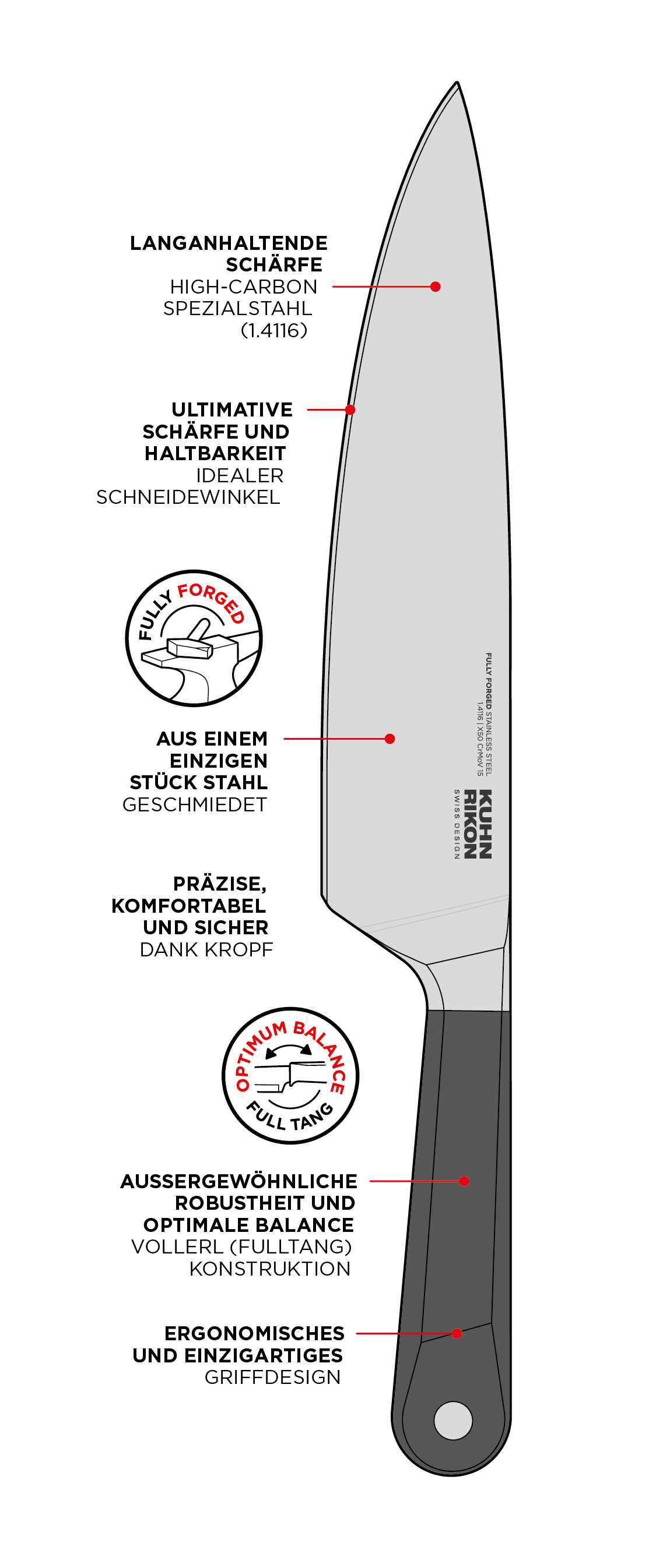 Gutes Design ist nicht nur Optik. Es unterstützt die Hand, führt die Bewegung, schafft Sicherheit - und wirkt dennoch selbstverständlich. Bei CULINARY FORGED verschmelzen Ästhetik und Funktion zu einer Einheit. Reduziert aufs Wesentliche, gezeichnet für den Alltag. Sie sehen es - und spüren es mit jedem Schnitt. Entwickelt in Rikon. Geschaffen für Ihre Küche.