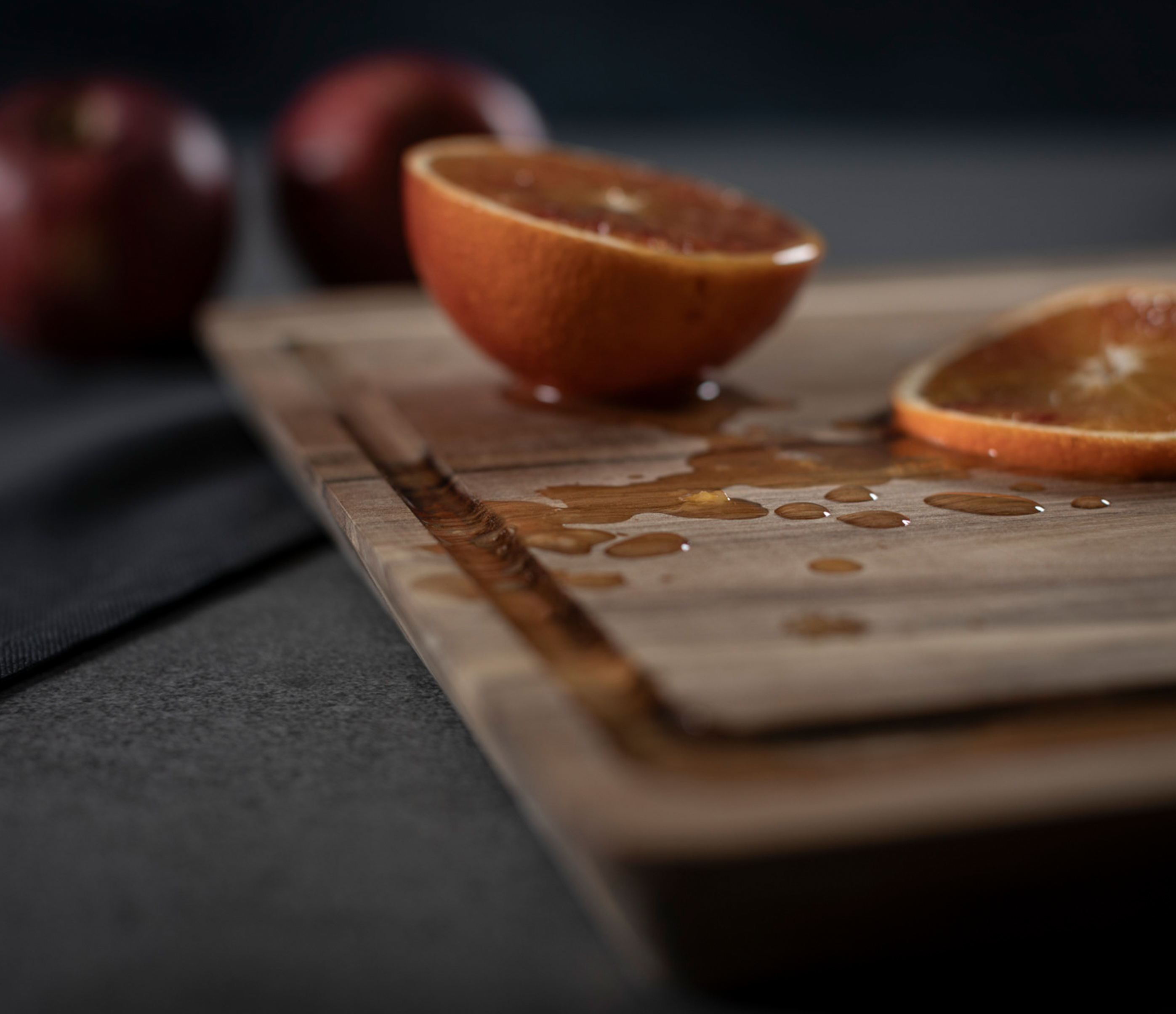 Flüssigkeiten laufen sauber in die Saftrille ohne sich anzusammeln.