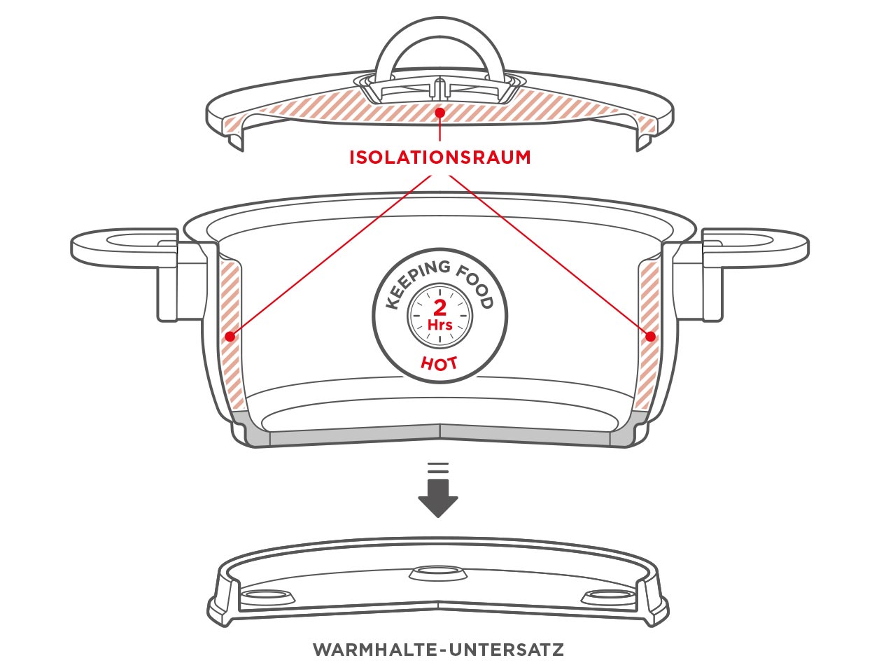 Die Kombination aus Doppelwand und magnetischem Warmhalteuntersatz hält Ihre Speisen bis zu zwei Stunden lang warm. Das erleichtert besonders bei aufwändigeren Menüs das Timing und somit den gesamten Kochprozess.