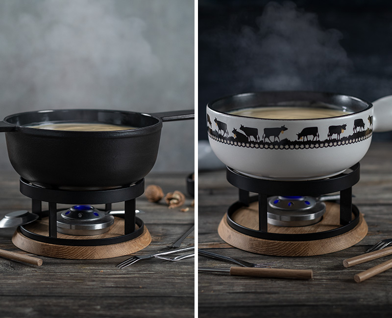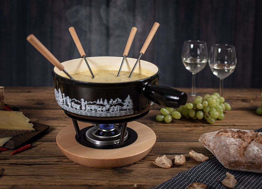 Warme Eiche, schwarzes Gusseisen und edle Keramik – drei Materialien für ein Fondue-Erlebnis mit Charakter. Rechaud, Gabeln und Sets sind optisch abgestimmt und flexibel kombinierbar. Für alle, die Fondue stilvoll inszenieren wollen.
