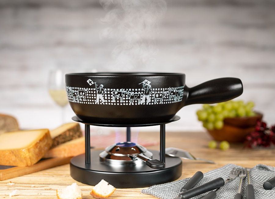 Fahnenschwingen hat in der Schweiz Tradition und gehört zu den ältesten Nationalsportarten. Das schwarz glasierte Caquelon mit edlem Dekor macht jeden Fondue-Plausch zum glänzenden Auftritt. Zum hochwertigen Caquelon erhalten Sie das passende Rechaud, einen Pastenbrenner gefüllt und 6 Gabeln. Einfach Brenner anzünden und geniessen.