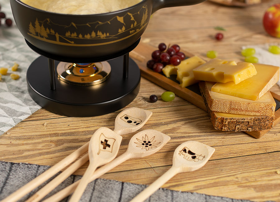 Die Holzkellen aus Buchenholz mit verschiedenen traditionellen Schweizer Sujets sind vielseitig einsetzbar und ideal zum Rühren im Fondue-Caquelon, Kochgeschirr oder Glasschüsseln, ohne antihaftbeschichtetes Kochgeschirr zu zerkratzen.