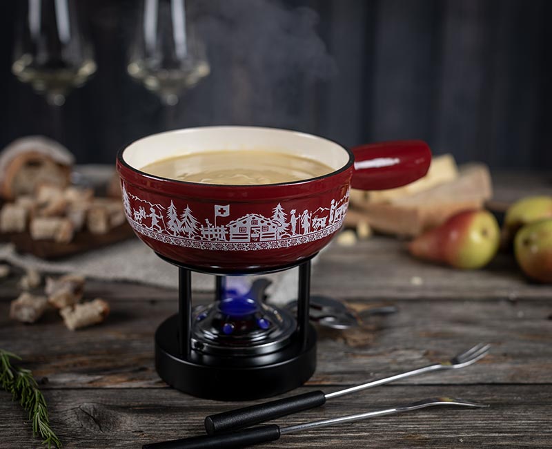 Holen Sie sich den Charme der Schweizer Alpen nach Hause - das rot glasierte Caquelon mit edlem Dekor macht jeden Fondue-Plausch zum glänzenden Auftritt.