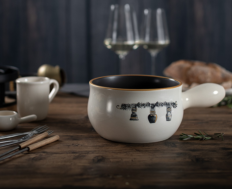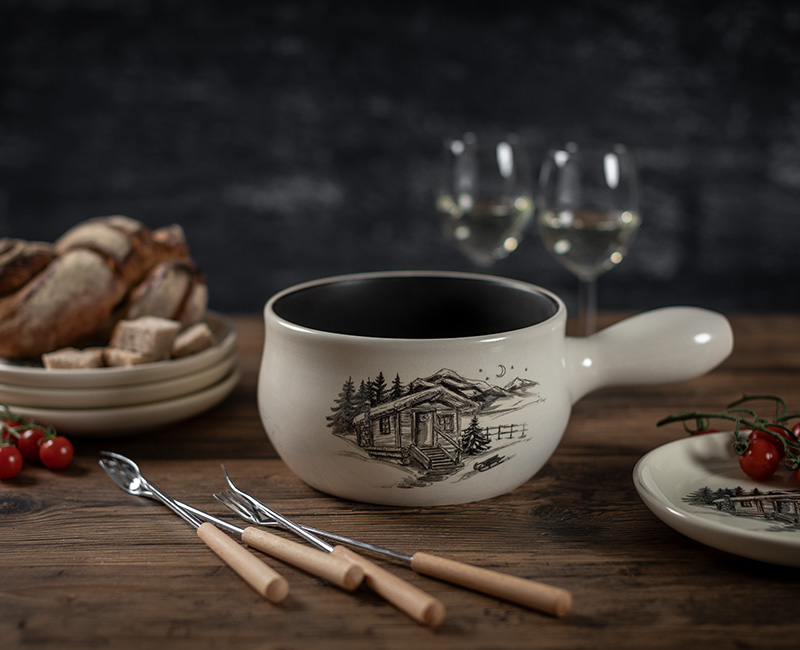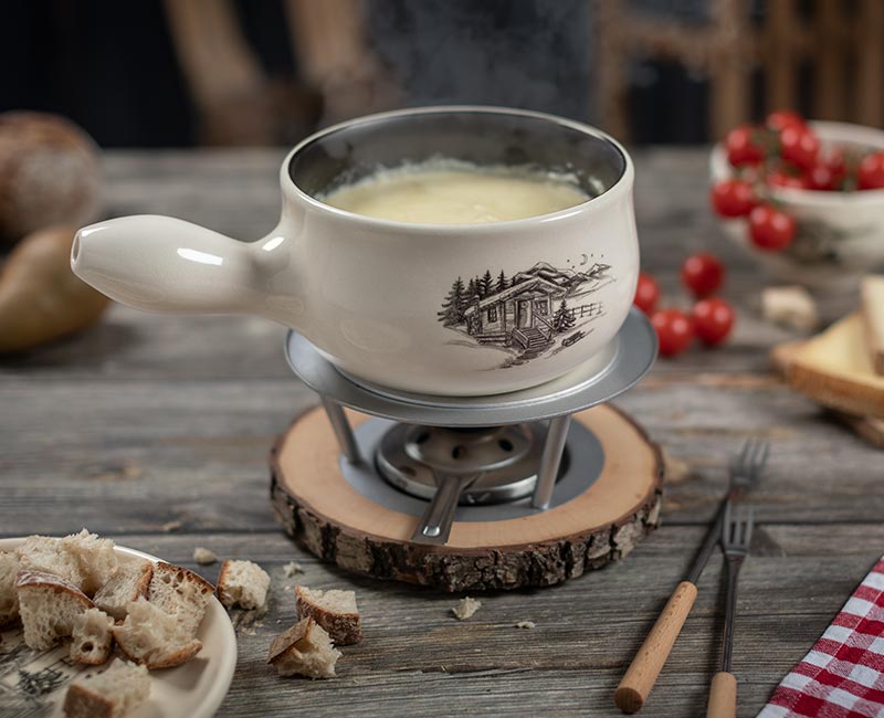 Dieses Caquelon ist der Beweis dafür, dass Fondue auch in kleiner Runde ein unvergessliches Erlebnis ist. Lassen Sie sich vom handgezeichneten Sujet in den Zauber der Alpen entführen und holen Sie sich echten Chalet-Charme auf Ihren Tisch.