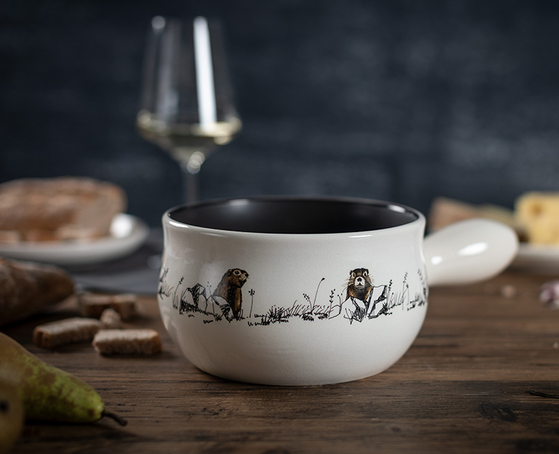 Neugierig und doch zurückhaltend entführen Sie die niedlichen Murmeli mitten in die Bündner Berge. Das liebevolle Sujet stammt aus der Feder unserer Designerin Nicole Wyss und bringt den Zauber alpiner Begegnungen auf Ihren Tisch. Ein Fondue-Topf mit Persönlichkeit – verspielt, herzlich und ganz nah an der Natur.