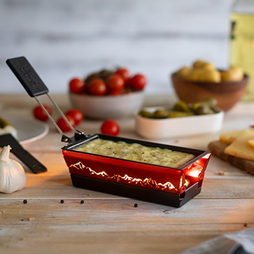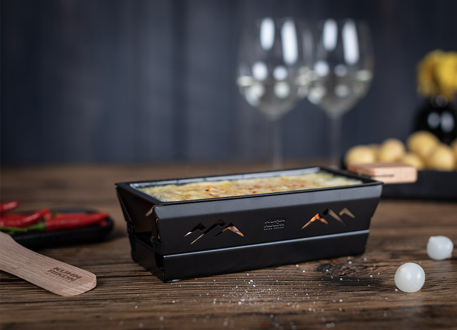 Besonders gemütlich wird es mit dem Raclette-Set „Berge“ im Kerzenschein. Die Zutaten werden im Grill-Pfännchen nur durch die Kerzenflamme in kürzester Zeit zum Garen gebracht. Das ausgestanzte Bergmotiv kommt bei lodernder Flamme besonders gut zur Geltung und hinterlässt einen bleibenden Eindruck.