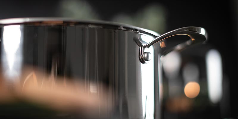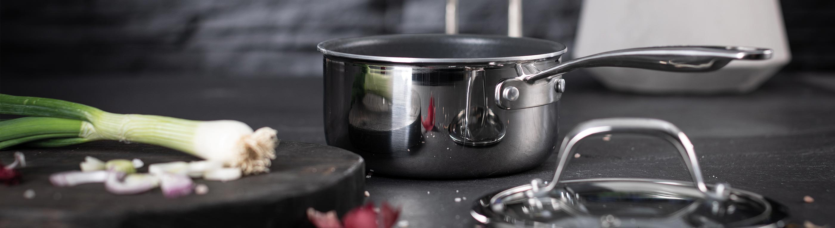 Das Mehrschichtmaterial (zweilagig: aussen Edelstahl, innen Aluminium) leitet die Hitze schnell und gleichmässig bis zum Rand.
