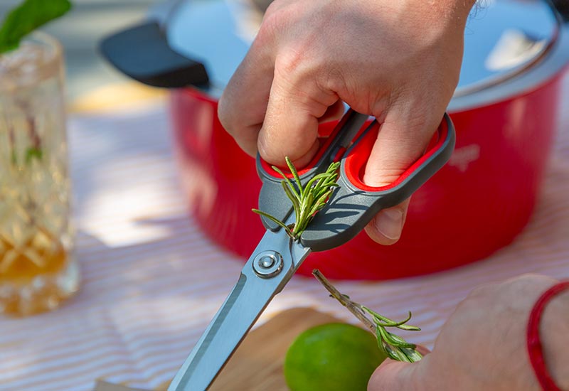 Erleben Sie die spritzige Kombination aus bitter, herb und prickelnd! Dafür einfach einen Zweig frischen Rosmarin mit unserer UNIVERSAL-SCHERE abschneiden und halbieren. Mit dem Kräuterabstreifer von einer Hälfte die Blätter abstreifen und zwischen den Fingern leicht verreiben. Dann Grapefruitsaft, Sprudelwasser, Rosmarinblätter und -zweig in ein Glas mit Eiswürfeln und leicht umrühren. Cin Cin!