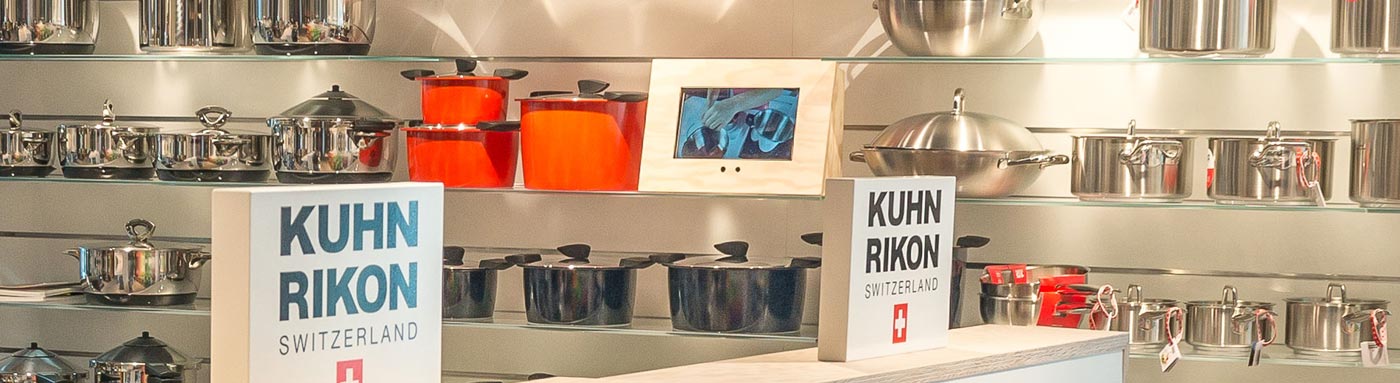 In our factory shop you benefit twice: you will receive competent advice and can buy our high-quality Kuhn Rikon products at unbeatable prices due to the very small flaws. The KUHN RIKON team is well-known for providing friendly and competent advice and looks forward to your visit. And as trying something out is far better than reading about things, you can try out all products in our shops and test them. This is because design, functionality and quality are much better assessed in practice.