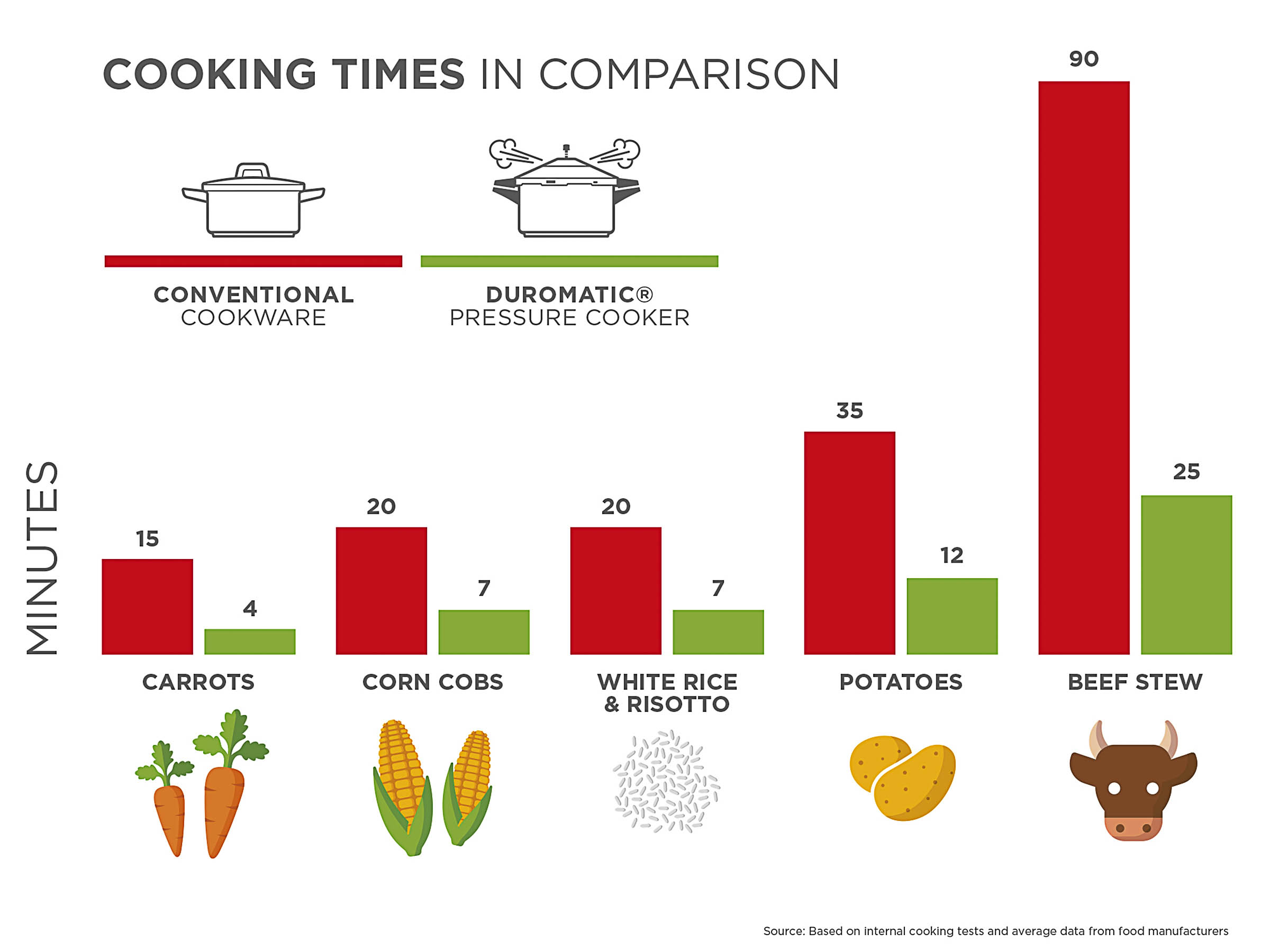 cookware. For example, carrots only need 4 minutes instead of 15. This saves you up to 70 % of the cooking time. Pressure cooking is that easy.