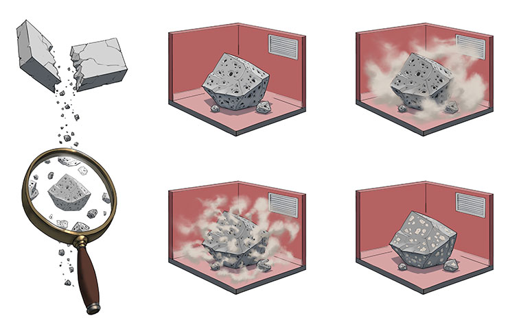 3. The secondary raw material is treated with pure CO2. A chemical reaction occurs in the pores of the concrete granules, producing natural limestone. The CO2 then remains permanently sequestered in the treated concrete granulate.
