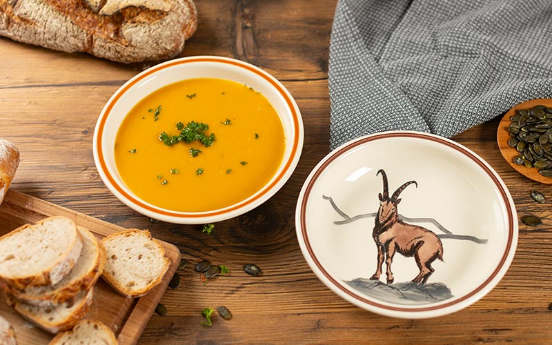 This plate takes you to the cosy parlour of an Engadine chalet. Banish the cold of winter with a hearty barley soup from the Grisons. Or discover the many possibilities and serve Birchermüesli, salads and much more in it. Enjoy your meal!