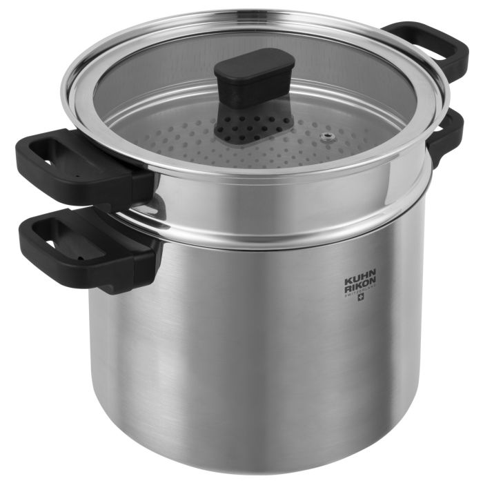 Of course, the pot can also be used without the strainer insert for preparing other dishes in large portions. Potatoes, vegetables, sauces and soups can also be prepared in a pasta pot from Kuhn Rikon.