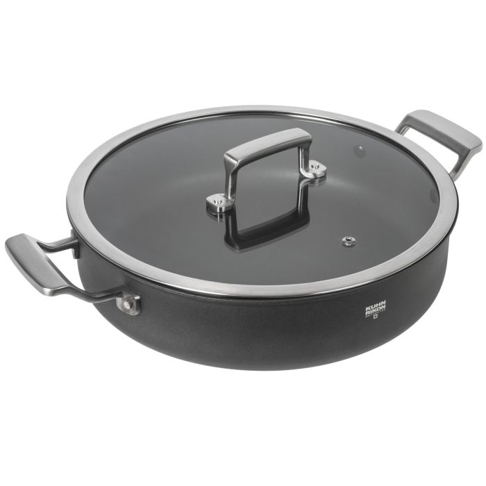 The ergonomic stainless steel side handles stay cool and are very comfortable to use. The glass lid with steam opening allows convenient visible cooking and prevents the lid from sticking when cooling down. The easy cleaning saves time and water and is another pleasant plus of this high-quality serving pan.