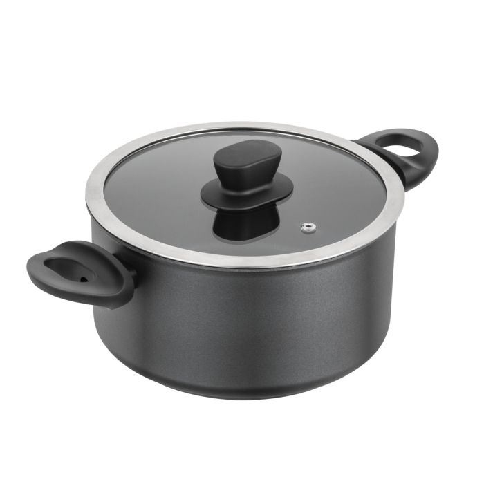 Whether it's pasta, vegetables, potatoes, meat or a delicious stew: it's easy to prepare in the practical cooking pot. The high-quality non-stick coating is ideal for low-fat cooking and prevents food from sticking. The ergonomic Bakelite side handles stay cool even at high temperatures. The glass lid with steam opening ensures convenient visual cooking and prevents unnecessary heat loss or a vacuum. The easy cleaning saves time and water and is another pleasant plus of this high-quality cooking pot.