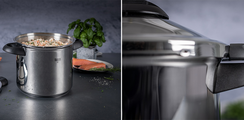 Des poignées améliorées, un élément de sécurité supplémentaire sur la poignée du manche et une graduation du volume en litres et en quarts offrent encore plus de confort. Le tout dans un nouveau design élégant - car il est bien connu que l'œil cuisine aussi.