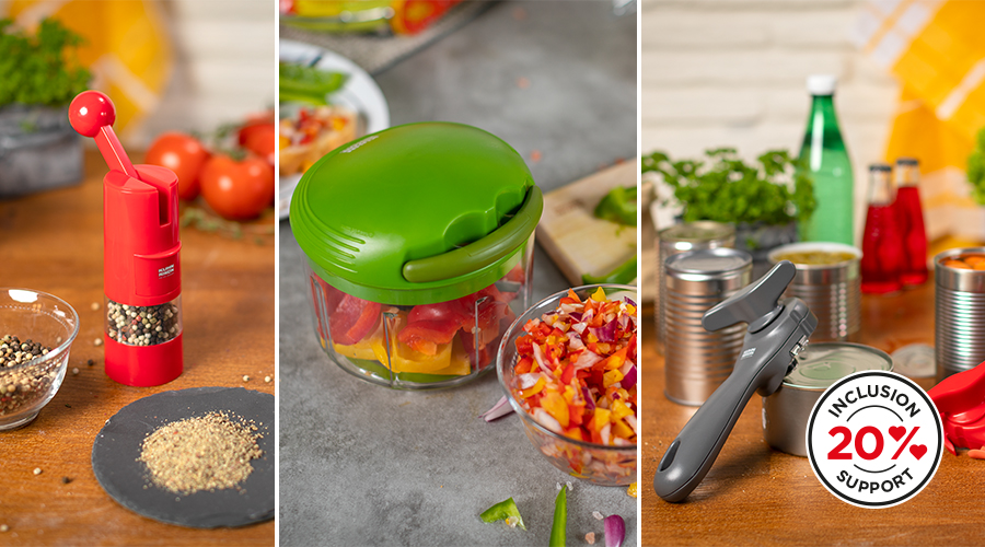 Ce mois-ci, trois nouveaux héros s'engagent pour plus d'inclusion dans la cuisine : « Ratchet », « Chop » et « Savety Master ». C'est pourquoi, en septembre, 20 % du chiffre d'affaires réalisé sur une sélection de gadgets sera reversé à Pro Infirmis.