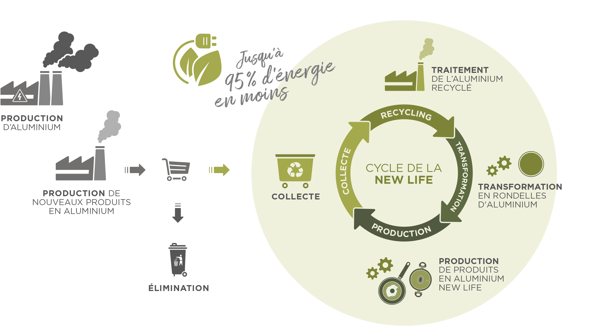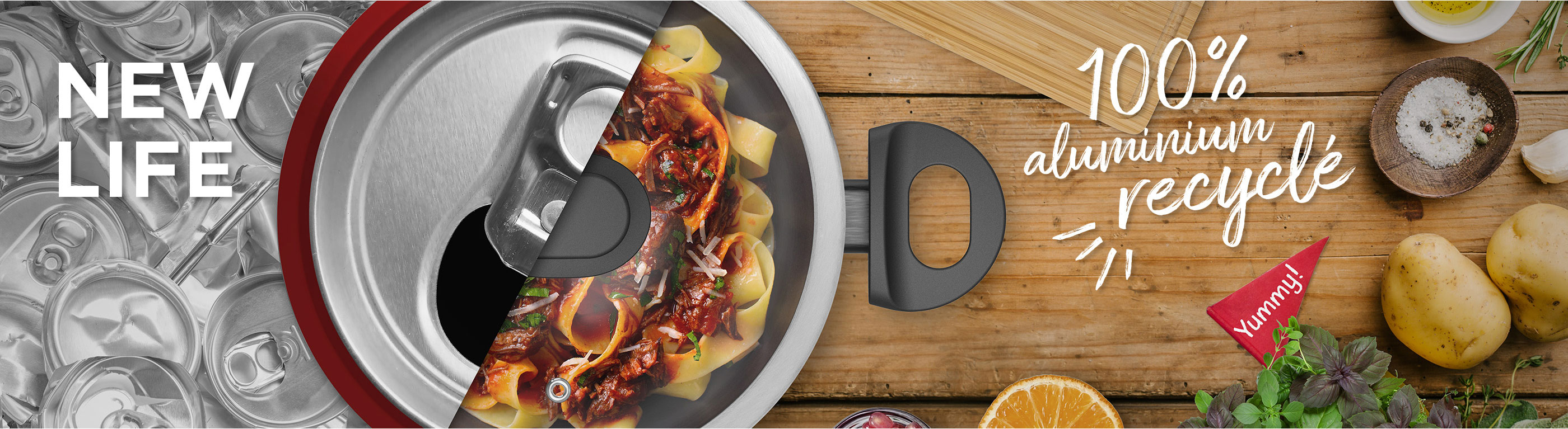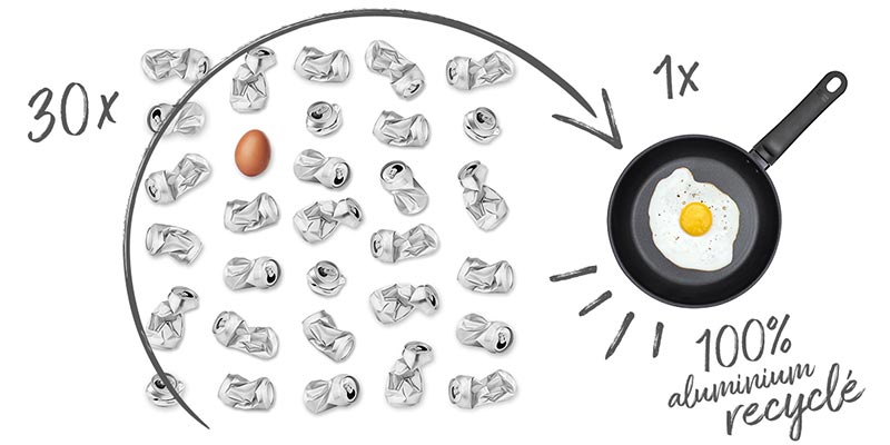 La nouvelle batterie de cuisine NEW LIFE® se compose à 100% d'aluminium recyclé européen et est produite avec jusqu’à 95% d'énergie en moins que les poêles en aluminium traditionnelles. Il faut recycler entre autre l'aluminium d'environ 30 canettes pour fabriquer une poêle NEW LIFE® de 24cm. Collecter les canettes en aluminium et les recycler correctement en vaut donc la peine. Qui sait, peut-être auront-elles bientôt le droit à une seconde vie?
