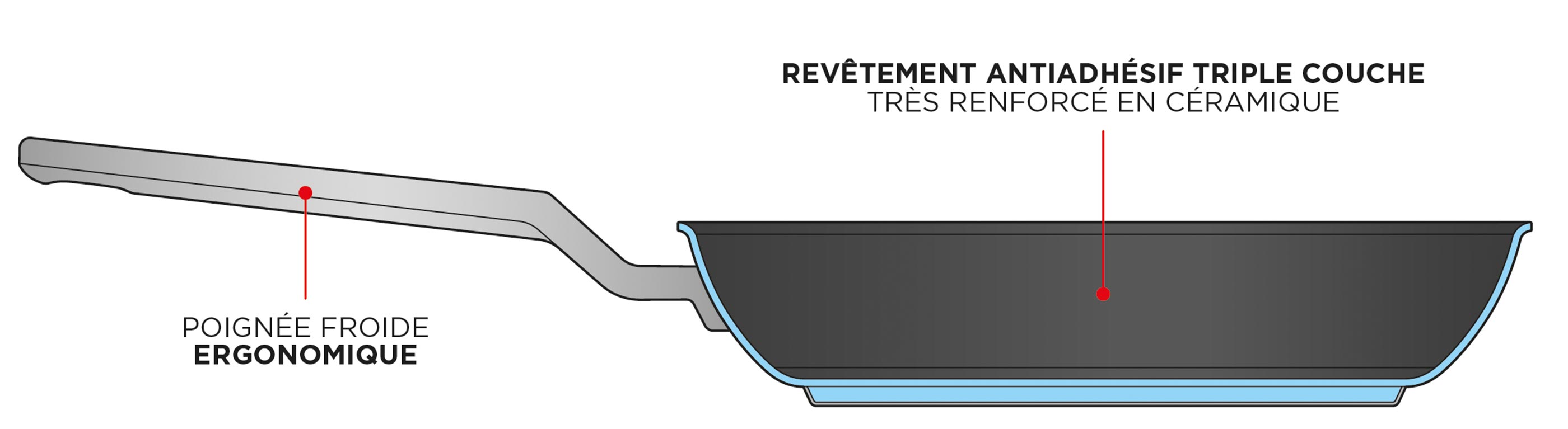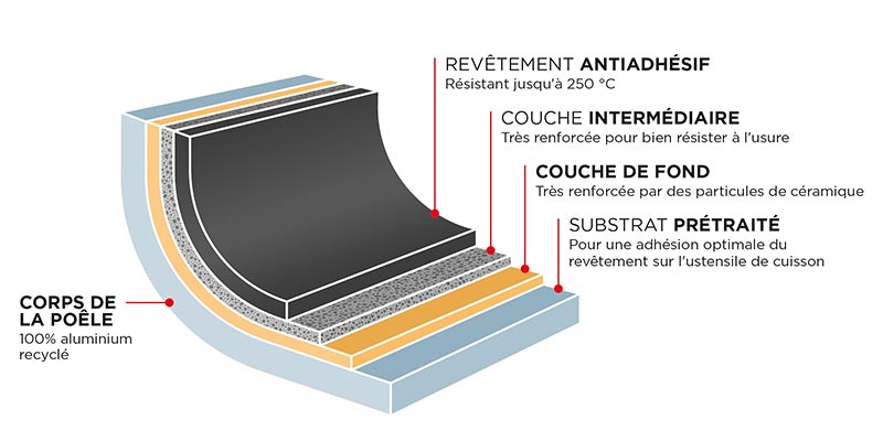 Le revêtement antiadhésif triple couche haut de gamme facilite la cuisson: l’ajout de matière grasse devient superflu et la cuisine donc encore plus saine. Les soufflés et les gâteaux ne collent pas dans un plat avec revêtement, ce qui facilite le service. Comme il n’est plus nécessaire de les faire tremper pendant des heures, les produits sont encore plus faciles à nettoyer. Quelques gouttes de liquide vaisselle suffisent et ils sont immédiatement propres! Le revêtement est imperméable. Il facilite le nettoyage et fait faire des économies de temps et d’eau.