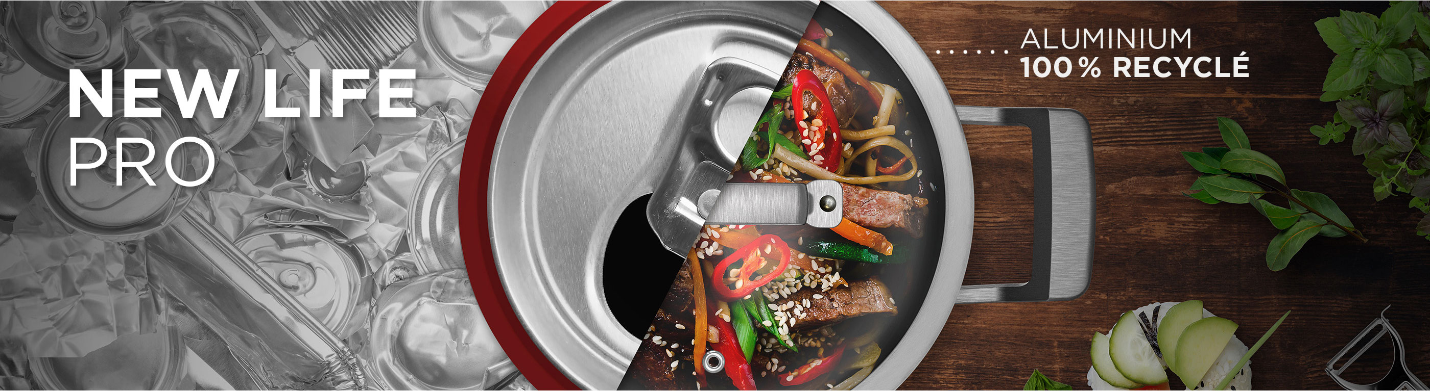 Nous sommes convaincus que nos produits doivent contribuer eux aussi à la lutte contre le changement climatique. C’est pourquoi nous avons lancé en 2021 la poêle à frire NEW LIFE® et au printemps 2022 la poêle à frire et le moule NEW LIFE® Pro. Son grand succès a confirmé que nous étions sur la bonne voie et nous a encouragés à poursuivre dans cette direction. Nous sommes heureux de pouvoir lancer sur le marché la batterie de cuisine NEW LIFE® Pro, également en aluminium 100% recyclé, à côté d’autres produits éco-responsables. La production d’aluminium recyclé nécessite considérablement moins d’énergie. Et ce n’est pas tout: au cours du processus de recyclage, le matériau devient même plus résistant et plus durable que l’aluminium neuf. L’action écologique responsable n’implique donc pas nécessairement de compromis.