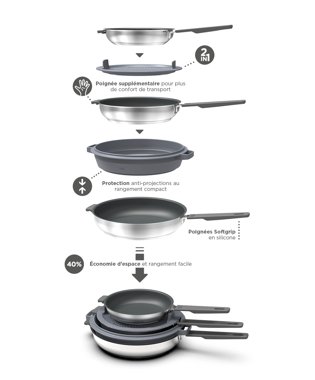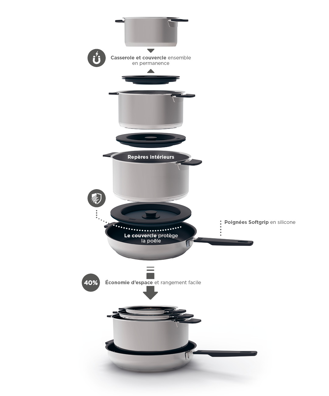 Les casseroles, les poêles et les protections anti-projections s’empilent parfaitement. Le couvercle adhère toujours au fond de la casserole grâce à un aimant intégré. Fini le désordre en cuisine! Un geste suffit pour saisir la casserole ou à la poêle et son couvercle. Grâce à ce design ultra-compact, fini les problèmes de rangement.