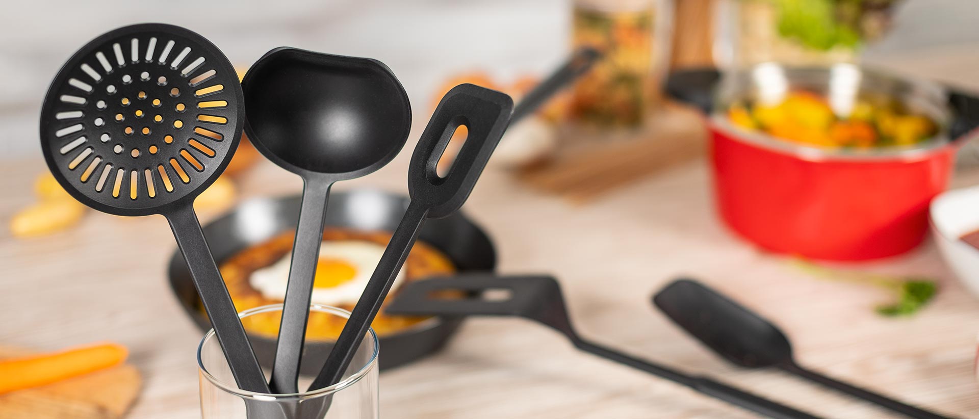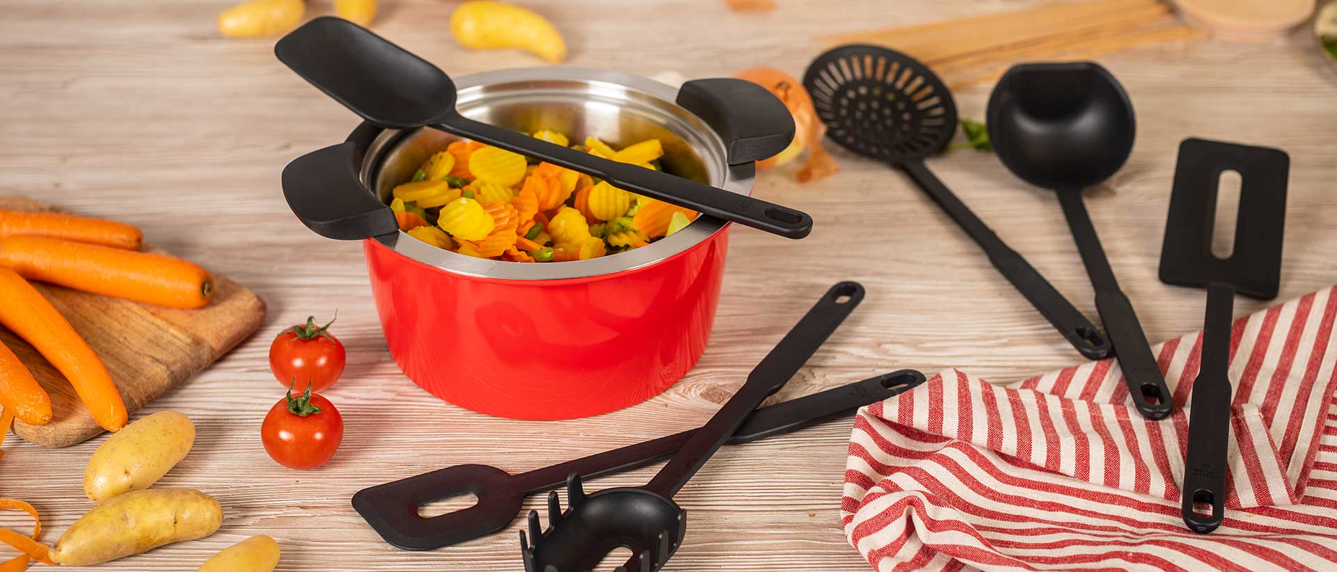 Les ustensiles en nylon peuvent être utilisés dans tous types de casseroles et de poêles, également les modèles avec revêtement, sans risque d’endommager celui-ci.