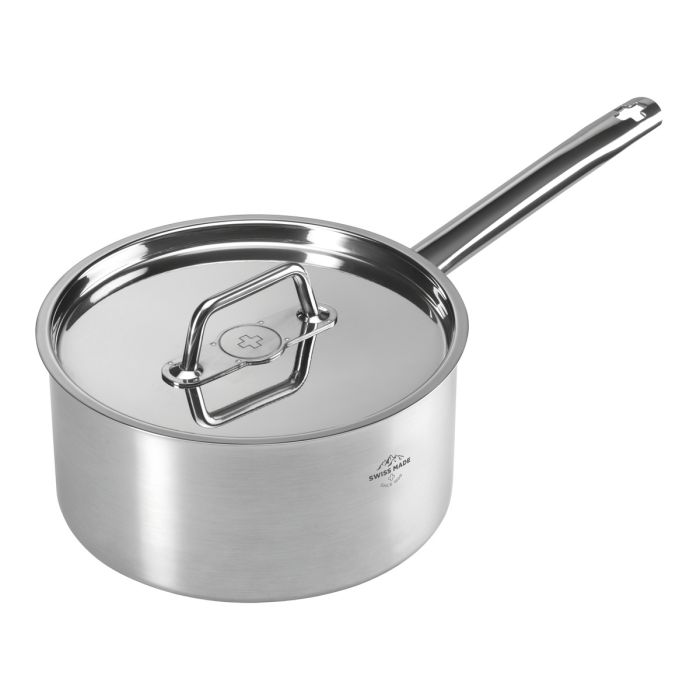 Les poignées en acier inoxydable développées par l'équipe de design suisse avec le soin du détail sont à la fois ergonomiques et robustes. Le versement est facilité par le bord légèrement voûté. La croix suisse gravée dans les poignées latérales et découpée dans les manches longues est le reflet d'une élégance intemporelle. Les ustensiles de cuisine MONTREUX peuvent être utilisés sur tous les types de cuisinières (induction / gaz / céramique / électrique / halogène). Les poignées ergonomiques en acier inoxydable sont résistantes à la chaleur et résistantes au four. Cela vous permet de saisir la viande à vif, puis poursuivre la cuisson dans le four. Grâce aux repères de remplissage à l’intérieur dans tous les faitouts et casseroles, l'addition de liquide peut être mesurée directement dans la casserole - plus besoin de récipient de mesure séparé.