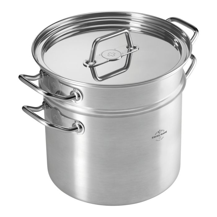 Les poignées en acier inoxydable développées par l'équipe de design suisse avec le soin du détail sont à la fois ergonomiques et robustes. Le versement est facilité par le bord légèrement voûté. La croix suisse gravée dans les poignées latérales et découpée dans les manches longues est le reflet d'une élégance intemporelle. Les ustensiles de cuisine MONTREUX peuvent être utilisés sur tous les types de cuisinières (induction / gaz / céramique / fonte / électrique / halogène). Les poignées ergonomiques en acier inoxydable sont résistantes à la chaleur et résistantes au four. Cela vous permet de saisir la viande à vif, puis poursuivre la cuisson dans le four. Grâce aux repères de remplissage à l’intérieur dans tous les faitouts et casseroles, l'addition de liquide peut être mesurée directement dans la casserole - plus besoin de récipient de mesure séparé.