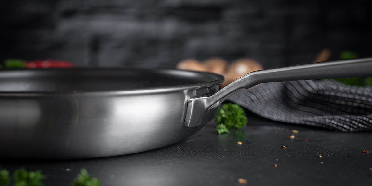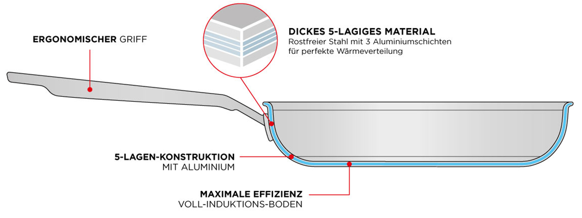 Fünf vollflächige Schichten aus Edelstahl und Aluminium sorgen für eine unübertroffene Wärmeverteilung. Dabei wird die Hitze gleichmässig vom Boden bis hoch in den Rand verteilt. Diese gleichbleibende Wärmeverteilung ist ein Garant für beständige Kochergebnisse. Erleben Sie perfekte Hitze. Überall.