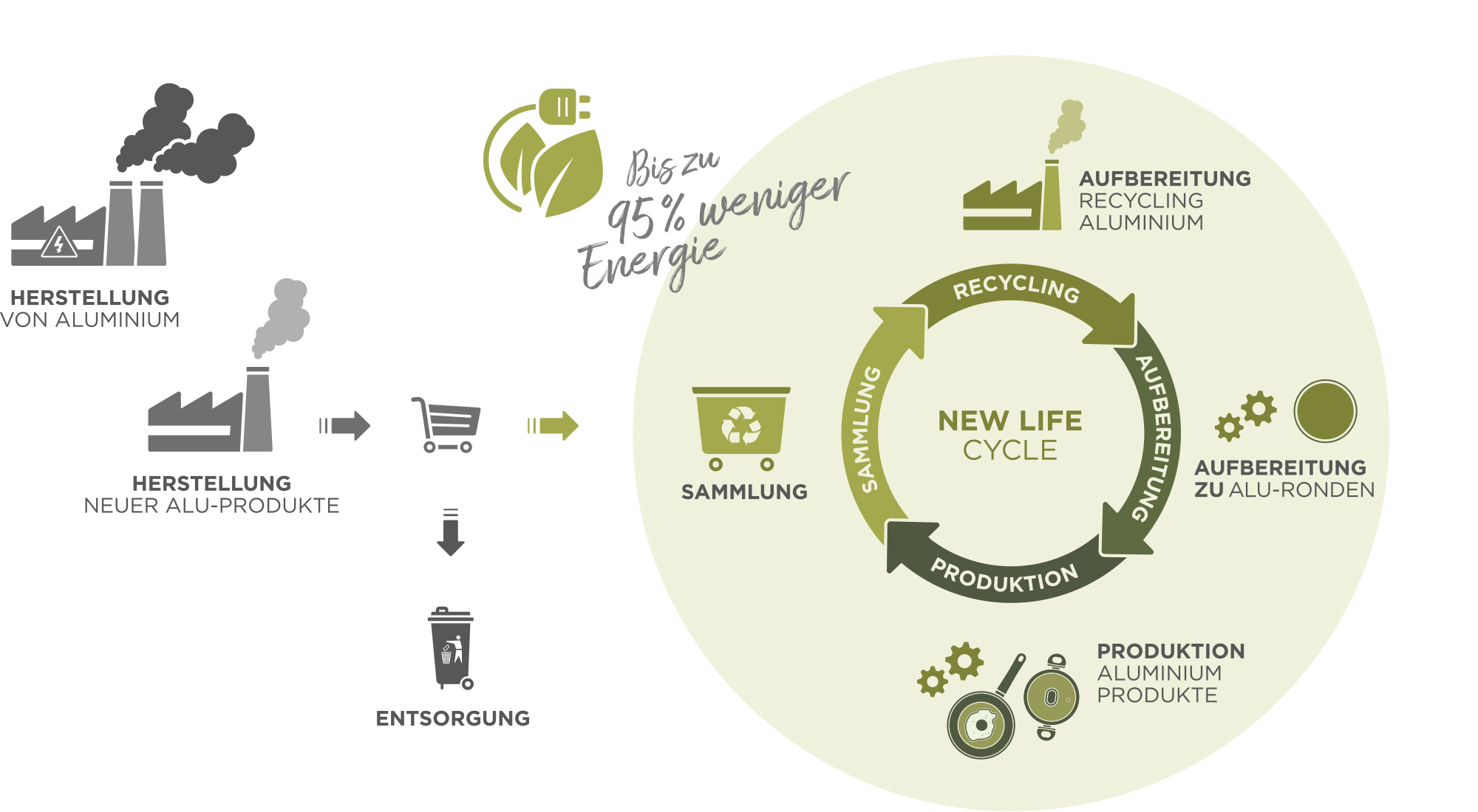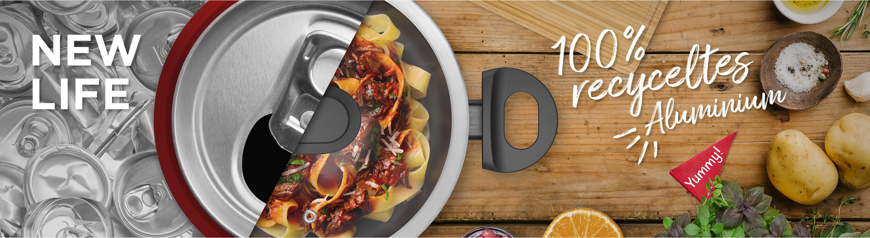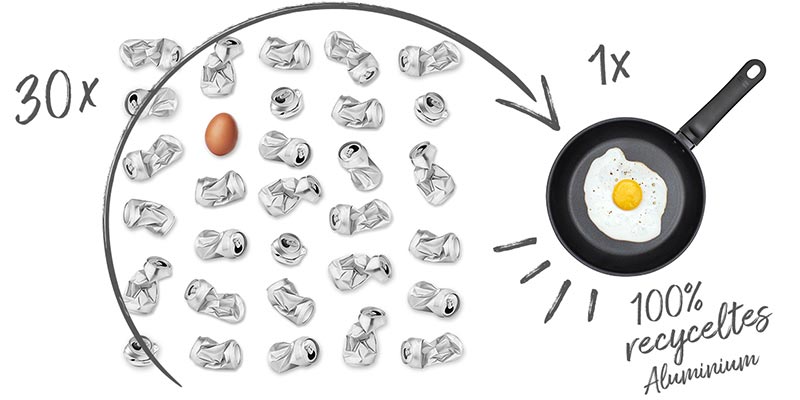 Das NEW LIFE® Koch- und Bratgeschirr besteht aus 100 % europäischem Recycling-Aluminium und wird mit bis zu 95 % weniger Energie als herkömmliche Alu-Pfannen hergestellt. Für die Herstellung einer Pfanne wird Aluminium unter anderem von rund 30 Dosen recycelt. Es lohnt sich also, Alu-Dosen zu sammeln und korrekt zu entsorgen. Denn wer weiss, vielleicht bekommen sie schon bald ein zweites Leben geschenkt.