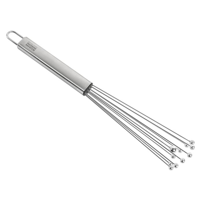 Mit dem Schneebesen/Schwingbesen Kugeln der stilvollen ESSENTIAL-Linie rühren Sie problemlos Sahne, Saucen, Marinaden oder Dressings in Sekundenschnelle. Durch die innovative Konstruktion der schwingenden Kugeln gelangt viel Luft unter die Rührmasse, dadurch gelingen auch Cremes und Suppen im Handumdrehen. Dank der großen Aufschlagfläche der Kugeln kann am Topfboden nichts anhaften und die flexiblen Drähte erreichen auch den äußersten Rand von Töpfen und Schüsseln mühelos. Der Schwingbesen ist pflegeleicht und lässt sich leicht reinigen.
