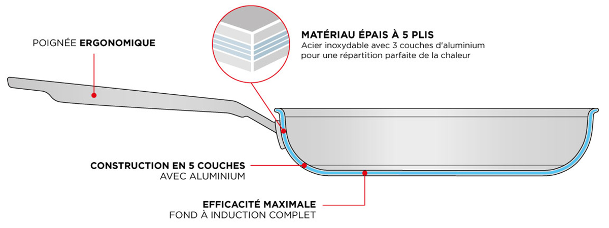 Cinq couches d'acier inoxydable et d'aluminium sur toute la surface assurent une répartition inégalée de la chaleur. La chaleur est répartie uniformément du fond jusqu'aux bords. Cette répartition uniforme de la chaleur garantit des résultats de cuisson constants. Profitez d'une chaleur parfaite. Partout.