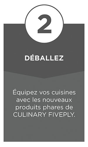 Dans cette gamme, il y en a pour tous les goûts culinaires. Créez votre propre gamme de produits CULINARY FIVEPLY. Quel que soit votre choix, vos nouveaux produits se distinguent par un design esthétique uniforme et des performances exceptionnelles.