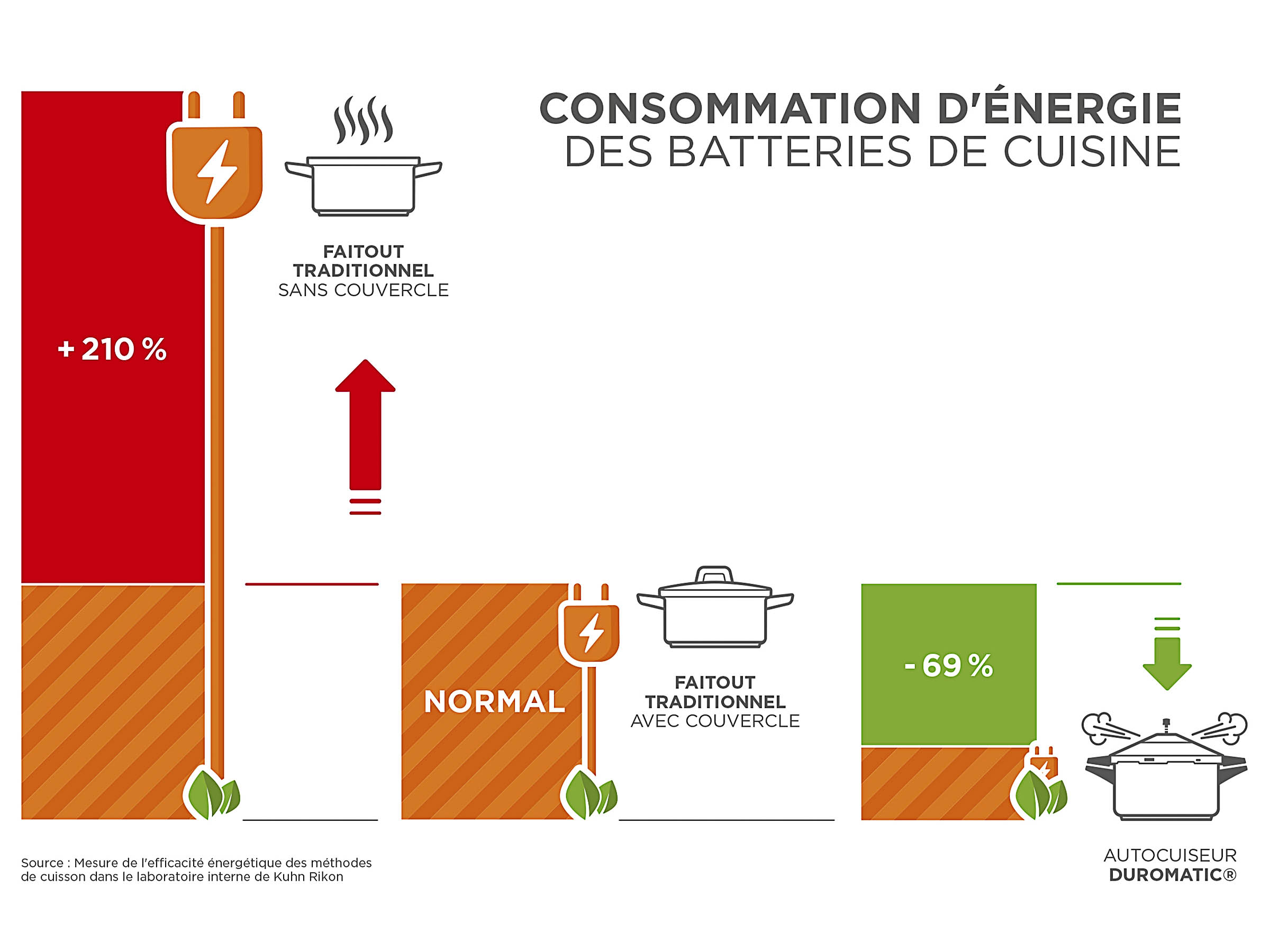 Par rapport à la cuisson avec des ustensiles de cuisine traditionnels avec couvercle, la cuisson rapide dans le DUROMATIC® vous permet d'économiser jusqu'à 69 % d'énergie. Sans couvercle, l'économie peut même atteindre 279 %. C'est aussi simple que cela pour préserver l'environnement et votre porte-monnaie.