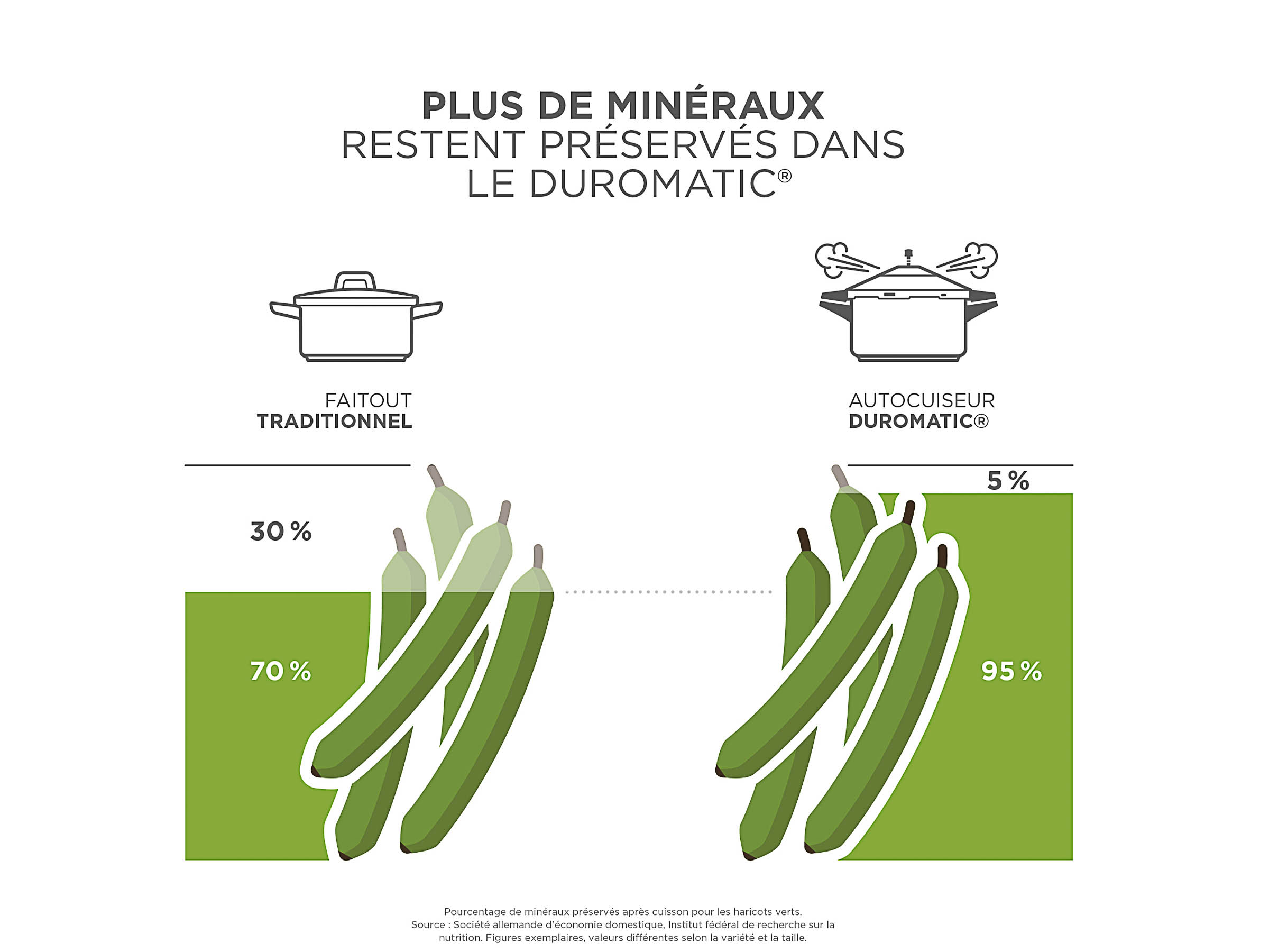 La fondation Warentest le montre également : dans les haricots verts, la cuisson à la vapeur préserve environ 36 % de minéraux en plus que la cuisson traditionnelle. Vous obtenez ainsi plus de ce qui compte vraiment.