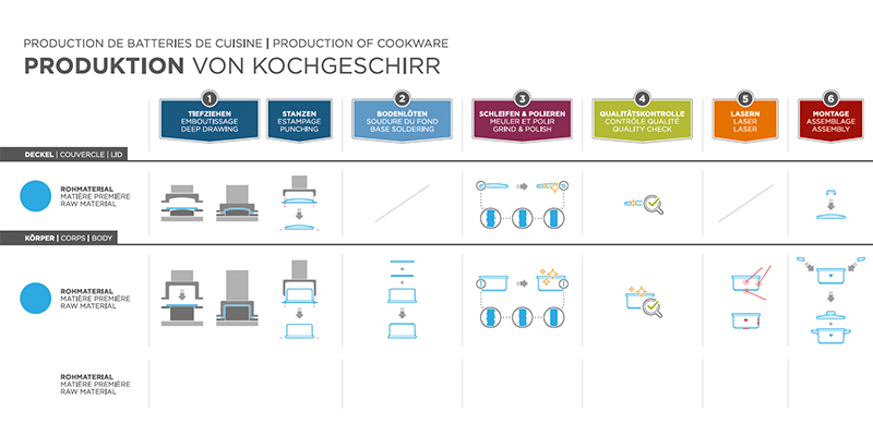 - ASSEMBLAGE: Pour finir, les poignées sont montées sur le couvercle et le corps, le tout est assemblé et emballé.