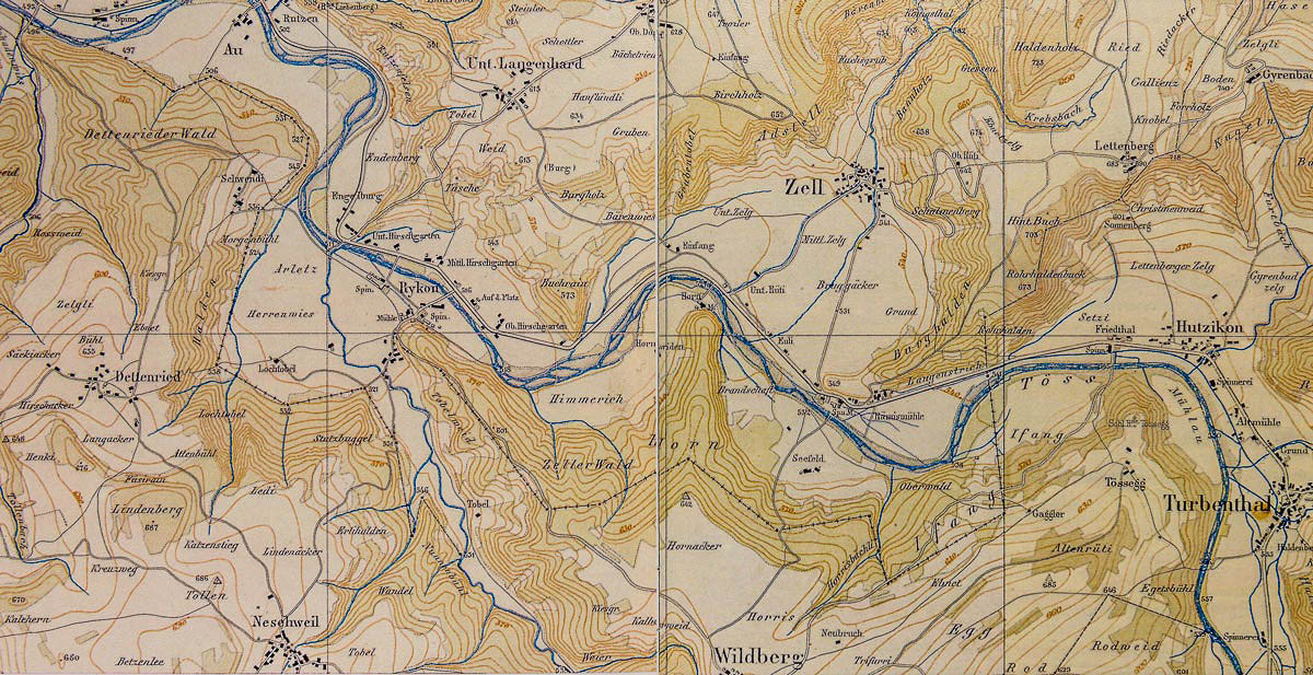 La filature manuelle est remplacée par la filature mécanique, le tissage à la main par le métier à tisser mécanique, la broderie à la main par les machines à broder. La Filature Rykon s’inscrit dans cette phase de développement. Elle est fondée en 1819 par le Dr. Bleuler sur le site actuel de Kuhn Rikon. Sur une carte de la période 1843-1846, on compte pas moins de 8 filatures et 4 moulins répartis sur 9 km de rivière.
