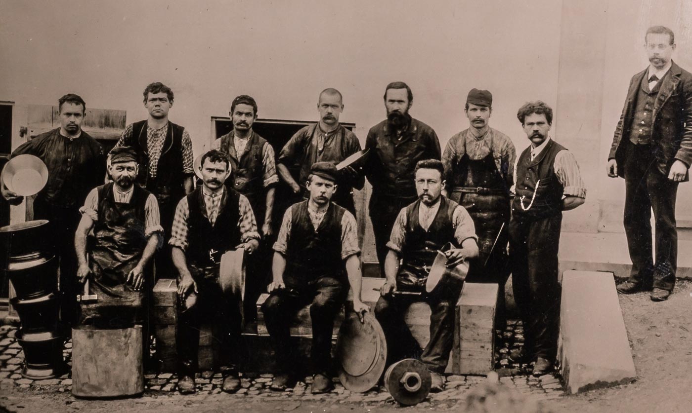 Les 24 employés de la fabrique de poêle Gebr. Kindermann posent devant le portail. Ils présentent avec fierté l’un des outils les plus importants de l'entreprise: la cisaille à tôle. D’autres outils ont été utilisés pour transformer la tôle en cuivre mou facile à embosser en casseroles : le marteau, l’enclume, le tour et la bordeuse.