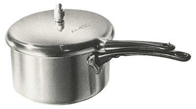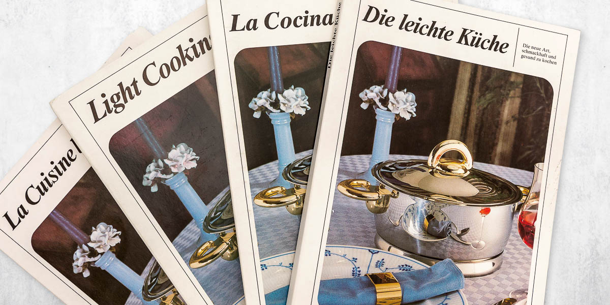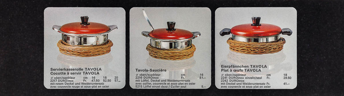 Kuhn Rikon sait anticiper les besoins des clients et développer une batterie de cuisine aussi belle que fonctionnelle. Un plat idéal pour la cuisine et le service. Le rédactionnel du prospectus de cette époque dit :