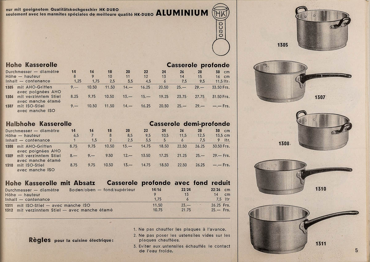 Heinrich Kuhn ne se contente pas de créer une batterie de cuisine adaptée à ce type d’énergie. Il définit la procédure pour la fabrication. Il fait couler une coquille en pur aluminium à la fonderie d’aluminium de Menziken. Il la transforme en batterie de cuisine électrique selon un procédé spécial breveté et la baptise DURO. Simultanément, il équipe ses faitouts des premières poignées résistantes à la chaleur et isolantes. Elles étaient composées à l’époque de plaque de fibres découpées et pressées ensemble, car les poignées plastiques actuelles n’existaient pas à l’époque.