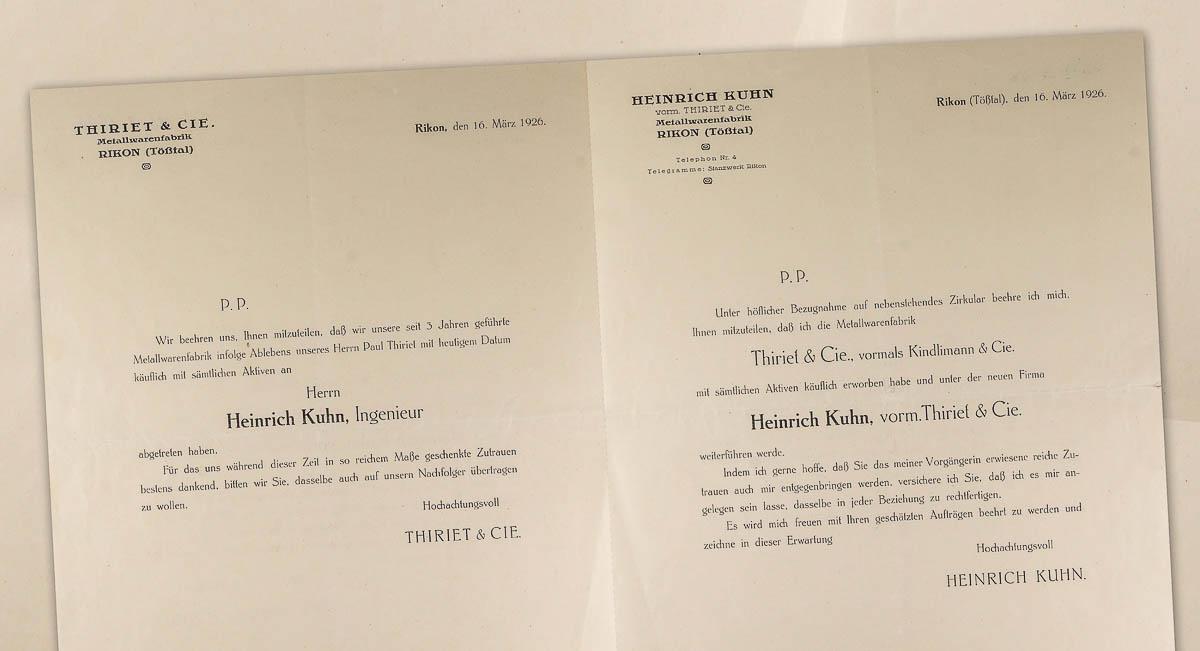 En 1925, Rikon constituait une base arrière potentielle pour le retour. Désormais âgé de 48 ans, Heinrich Kuhn-Boller se décide sans hésiter à retourner dans son pays d’origine. Il voit en l'achat de l'entreprise Thiriet & Cie l’opportunité tant attendue.